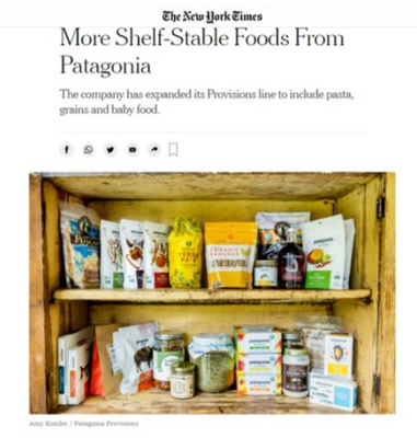 April 20, 2020 - "For several years, Patagonia, the outdoor gear company, has been selling a line of packaged shelf-stable, backpack-friendly foods like hot-smoked fish, dried fruit, snacks and soup mixes. Now they have expanded it to include pasta and sauces, nuts, grains and even baby food, not all of it packaged to carry on the trail.."